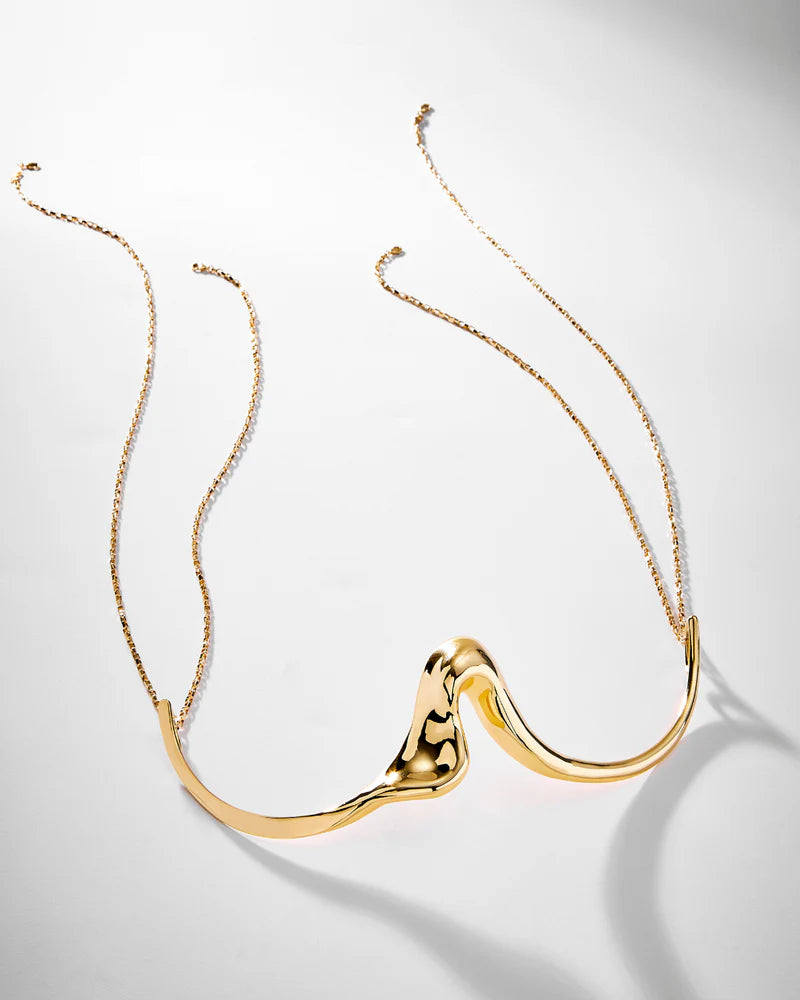 The wind and time are invisible yet powerful forces that sculpt the world around them with precision and patience. Following this concept, we created jewelry that seems to be shaped by these forces over a long journey, with fluid and light movements that flow around the body like the gentle touch of a desert breeze. The Vento bra features organic, voluminous shapes that evoke this sensation. Made from metal and noble plating, it adorns the body in an exuberant and powerful way, much like the winds of the desert.